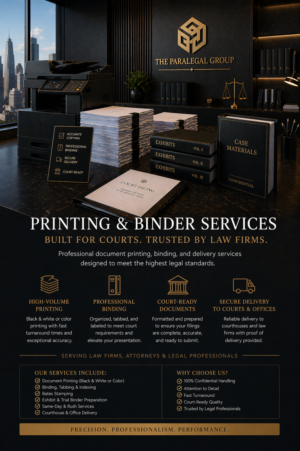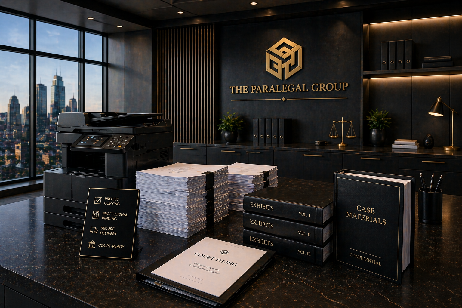 The Paralegal Group provides professional legal document copying and secure delivery services for law firms, businesses, and individuals requiring accurate, organized, and court-ready documentation.